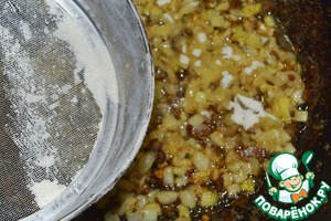 Добавить муку, перемешать и еще немного обжарить.
