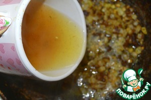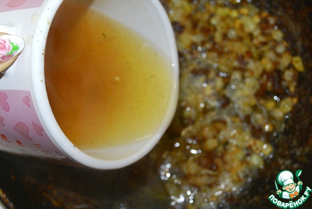 Влить вино и концентрированный бульон. Прокипятить в течение 5 минут и заправить сливочным маслом.