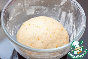 Апельсины хорошо помыть и ошпарить кипятком. Просеять муку, семена аниса перетереть в ступке, сухие дрожжи растворить в 5-6 ст. л. теплой воды. В муку всыпать анис, соль, сахар, цедру двух апельсинов, влить растворенные дрожжи, 9-10 ст. л. теплой воды и экстракт флердоранжа*