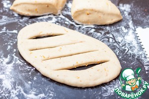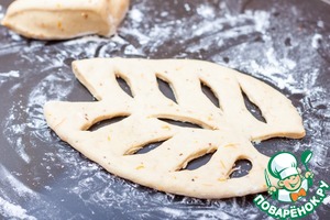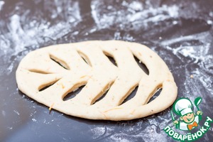 Еще один вариант овальной пышки, который напоминает резной лист монстеры - по длине овала прорезаем три как бы пунктирных линии, затем справа и слева от них делаем еще несколько прорезей, лепешку немного растягиваем, чтобы "пунктиры" разошлись