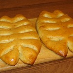 Это самый распространенный вариант - круглая пышка, большие прорези в которой делаются при помощи деревянной лопатки, а маленькие в центре - узкой стороной рукоятки той же лопатки. -