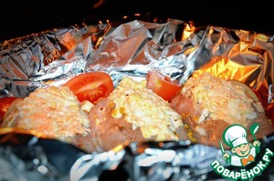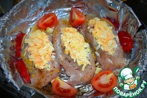 В смазанную маслом форму выкладываем филе.. рядом кладем помидор, чеснок и яблоко (оно на вкус.. я люблю!)