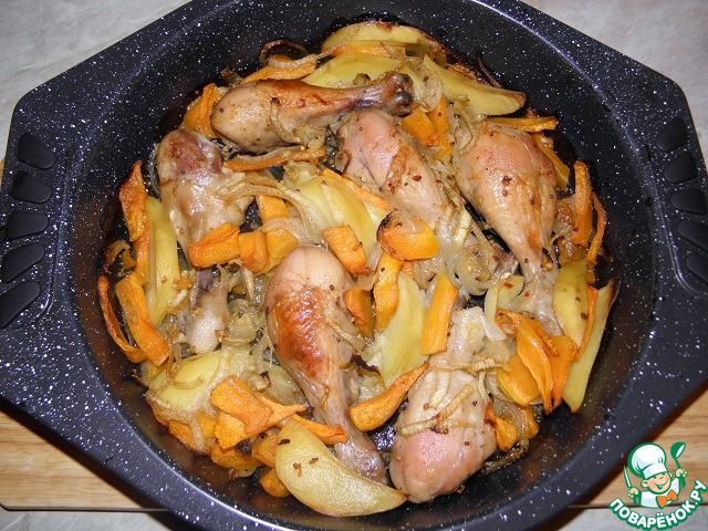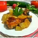 В меню без курицы нельзя! И тыкву уважаю я! А если их соединить, то можно блюдо полюбить! Чеснока немножко, лука и картошки! А еще для счастья надо, нам простого маринада! Все! Готово! Запекаем! И любимых угощаем! Пригодится и на ужин, замечательно в обед! Может быть кому-то нужен будет столь простой рецепт!