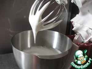 Для меренги взбиваем охлажденные белки со щепоткой соли, затем медленно всыпаем сахар и когда белки уже хорошо подняты добавляем цедру и еще взбиваем несколько секунд. Если при поднятии венчика, мы видим вот такой клювик, значит наша меренга хорошо взбита.