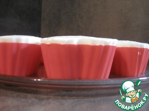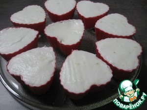 Выкладываем меренгу в силиконовые формочки, хорошо вымешивая при этом ложечкой, что-бы не было воздушных пустот. Затем ножом (шпателем) поверху снимаем излишки.