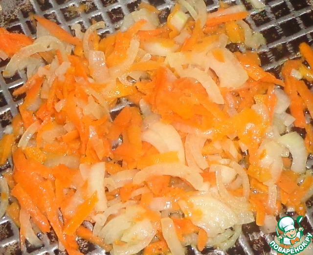 Морковь натереть на крупной терке. репчатый лук порезать по своему желанию. Морковь с луком протушить с добавлением растительного масла.