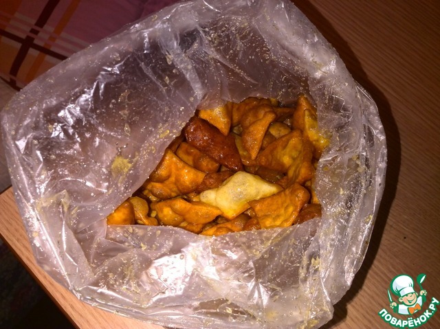 Тесто тонко раскатать и нарезать квадратиками, со стороной 1-2 см. Обжарить их в большом количестве горячего масла. Мешать очень аккуратно, так как квадратики вздуются и превратятся в подушечки-тышки. Стараемся их не поломать.