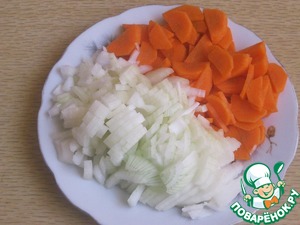 Лук и морковь порезать. Выложить в глубокую сковороду с разогретым маслом и обжаривать до слегка золотистого цвета.