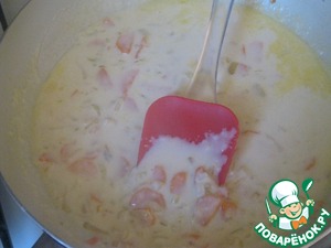 Посыпать мукой, перемешать. Вливать в сковороду молоко, в котором варилась рыба, небольшими порциями, тщательно перемешивая. Дать загустеть.