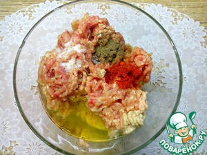 Добавляем в фарш соль, перец, белки яичные, я добавила еще паприку. Хорошенько вымешиваем и отбиваем.