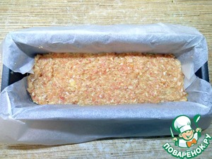 Форму для запекания для удобства застилаем пергаментом, смазываем 1 ч. л. растительного масла. Выкладываем половину фарша, разравниваем ложкой.