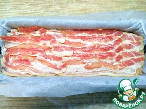 Ставим запекаться в духовку при t 200C в течение 45-50 минут. К концу запекания на беконе скапливается вытопленный жир, аккуратно убрать его силиконовой кистью, просто слить в форму и оставить еще на немного, чтобы бекон зажарился. Если есть конвекция, можно использовать ее.