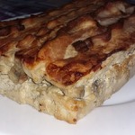 На грибы выкладываем вторую половину фарша, разровняем. Сверху внахлест укладываем полоски бекона.