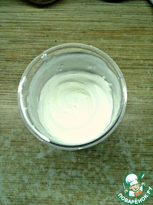 Белки взбить до мягких пиков, затем, постепенно добавляя сахар, взбить до крепких пиков.