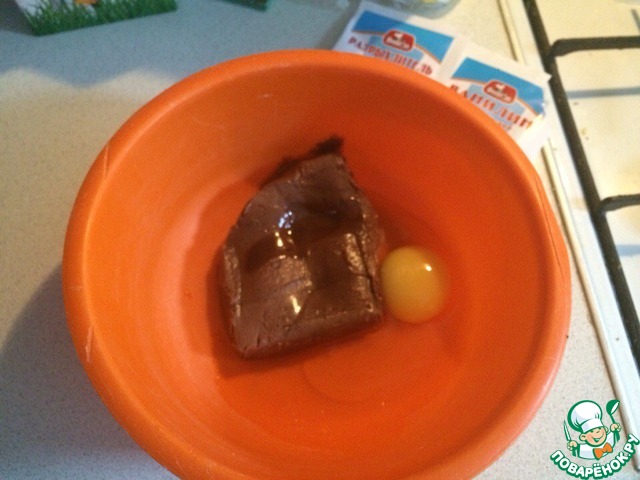 Чуть подтаявшее шоколадное масло тщательно перемешиваем с яйцом.