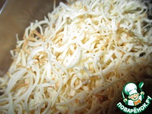 Колбасный сыр натереть на мелкой тёрке. Он нам потом понадобится.