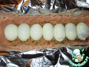 Яйца, сваренные вкрутую, очистить и разрезать пополам. Выложить половинки срезом на лук, плотно друг к другу.