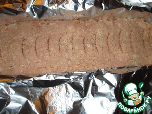Перемешать оставшиеся хлопья с тёртым колбасным сыром. Выложить эту смесь сверху. Утрамбовать. Уделить внимание бокам запеканки, хорошенько туда протолкнуть смесь хлопьев.. Накрыть фольгой и поставить в разогретую до 180 градусов духовку на 20 минут. Потом открыть фольгу через 20 минут и поставить обратно в духовку ещё на 20 минут.