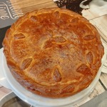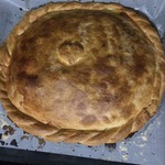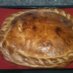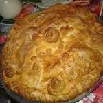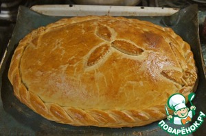 От второй части отрезать два валика теста для украшения. Оставшееся тесто так же раскатать в овальную лепешку. Края нижнего пласта смазать белком и накрыть начинку второй лепешкой, прижимая по краю к нижнему пласту.