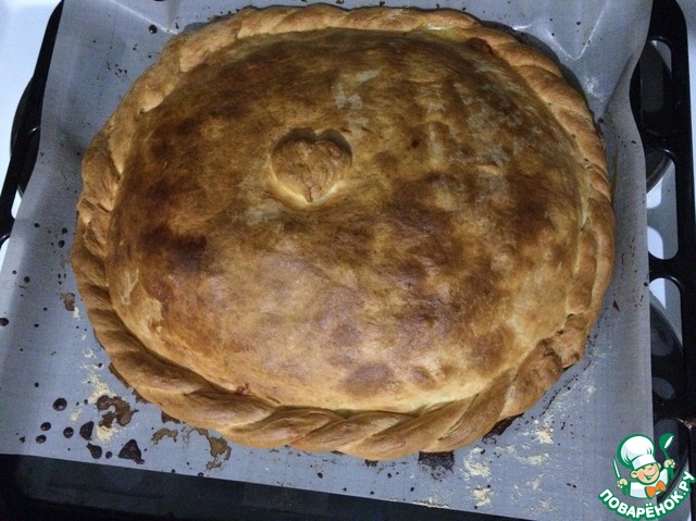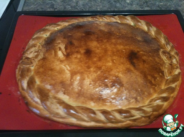 Готовый пирог осторожно снять с противня и, по возможности, уложить на решетку. Сверху укрыть салфеткой.