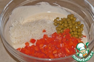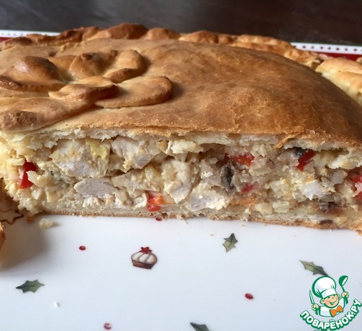 Начинку немного изменила. Добавила опята,добавила 2 плавленных сырка.Не добавляла перец,горошек и рис.