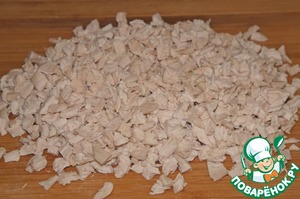 Подготовить продукты для начинки, чтобы все было под рукой и ничего не забыть. Заранее отварить мясо (мне хватило 3 филе) и рис (1 пакетик). Мелко нарезать 1 крупную луковицу. Шампиньоны очистить и нарезать пластинками, перец - маленькими квадратиками.