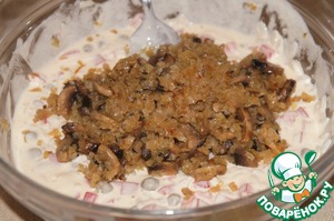 Добавить очищенные и нарезанные пластинками шампиньоны. Держать на огне, пока не выпарится грибной сок. Отставить в сторонку остывать.