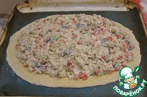 Меньшую часть раскатать в большую овальную лепешку и уложить на противень, смазанный маслом. Я использовала силиконовый коврик для выпечки.