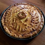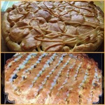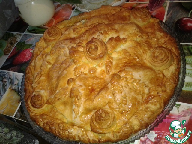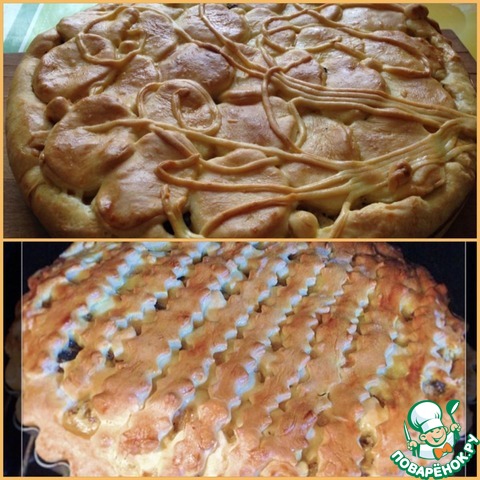 Отложенные кусочки теста раскатать в длинные валики, разрезать вдоль и сплести жгутики. Края пирога смазать белком и выложить жгуты. Места соединения жгутов прикрыть листочками из теста. Сверху пирог смазать желтком, взбитым с молоком.