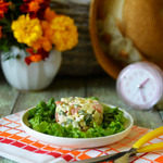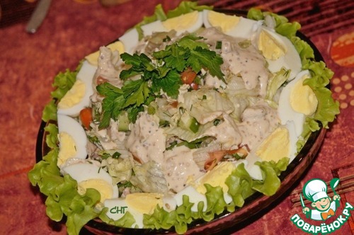 Выложить смесь на плоское блюдо и полить соусом. Украсить половинками яиц и зеленью.