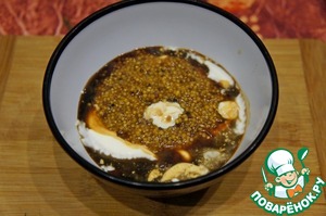 Смешать в мисочке сметану, соевый соус и горчицу.