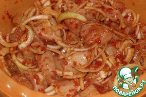 Куриное филе пересыпать луком и залить маринадом. Всё хорошо перемешать. Убрать на ночь в холодильник. Можно и меньше мариновать. Но так курочка будет мягче и ароматнее.