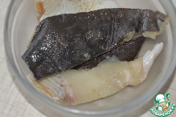 3. Камбалу почистить, филировать. У меня большая, я каждое филе разрезала еще на 2 половинки. Рыбу посолить, поперчить, сбрызнуть оливковым маслом, перемешать и оставить на 15 минут.