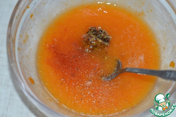 4. С хурмы снять кожицу, удалить косточки, размять вилкой. Можно пробить блендером. Добавить уксус, горчицу, соль, перец. Скорректировать соус по своему вкусу.