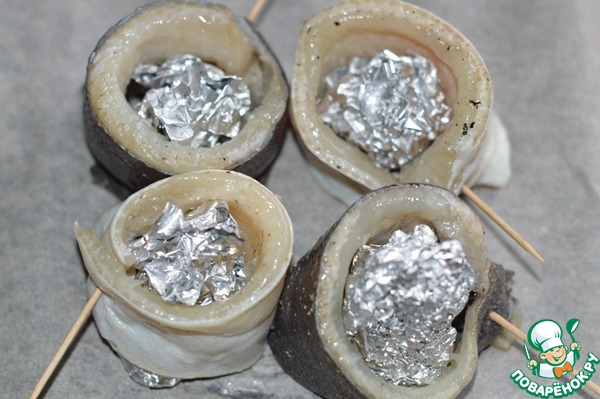 5. Противень застелить пергаментом, духовку разогреть до 180С. Камбалу свернуть как на фото, скрепить зубочисткой, внутрь выложить кусочки фольги. Отправить рыбу в духовку на 5 минут.