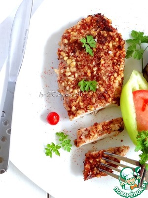 "Escalope de poulet au muesli" - дословно "Куриные котлеты с мюсли" - вкусное блюдо из грудок курицы или индейки, панированных в орехах с йогуртом и ароматом груши! Подавать блюдо как закуску с овощами, я приготовила с розой из баклажана - угощайтесь!