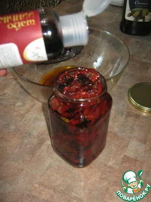 Заправить помидоры, плотно натолкать их в банки (чтобы масло выступило на сантиметр от помидор) и сверху ещё в каждую примерно по чайной ложке бальзамика.