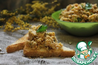 Пока выпекается наш омлет, делаем сырную массу из натёртых на мелкой тёрке плавленых сырков, чеснока и майонеза.