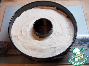 Перекладываем в форму. У меня большая 26 см. На даче делала половину порции в маленькой стеклянной миске. Стеклянную посуду ничем не смазывала. Металлическую форму смазала чуть-чуть растительным маслом.