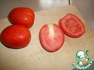 • Помидоры вымыть, разрезать пополам, осторожно удалить мякоть. Чуть посолить.