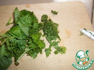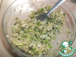 • Лук, панировочные сухари, 2 ст. л. оливкового масла, соль, черный свежемолотый перец и щепотку тимьяна. Все тщательно перемешать вилкой. Лук и зелень дадут сок и соединятся с панировочными сухарями.