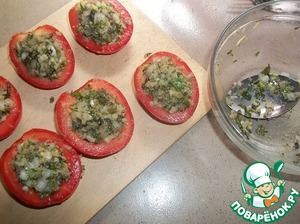 • Включить духовку. Начинить плотно половинки помидор фаршем, сбрызнуть маслом.
