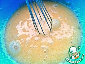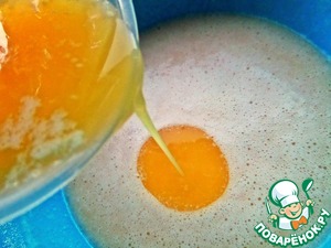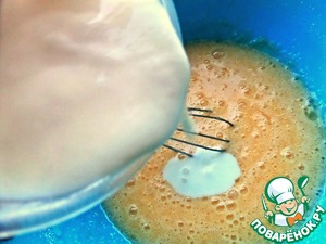 Отмеряем стаканчиком йогурт (у меня питьевой персиковый, но можно любой), выливаем. Взбиваем.