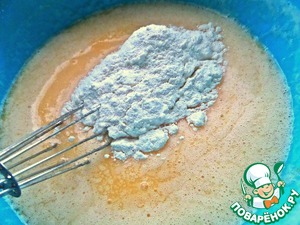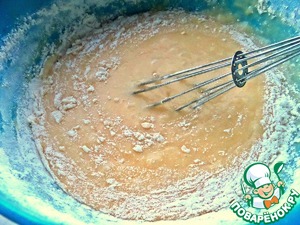 Всыпаем просеянную муку с разрыхлителем. Нужно 2 йогуртовых стаканчика муки или 2 раза по 125 мл.
