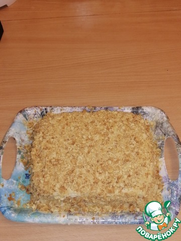 Собираем торт, промазываем коржи кремом, обмазать по краям и обсыпать крошкой, сделанной из обрезков. Поставить в холодильник на ночь.