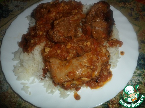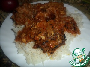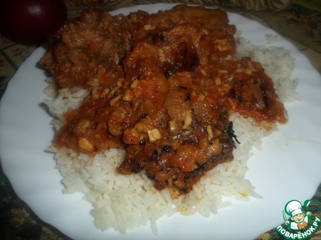 На тарелку выкладываем рис, сверху выкладываем мясо с соусом и наслаждаемся.