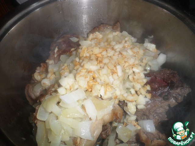 Слегка обжарим мясо, затем добавим поочередно лук и чеснок и обжарим пока не уйдет запах сырого лука и чеснока.