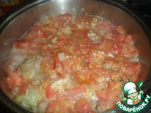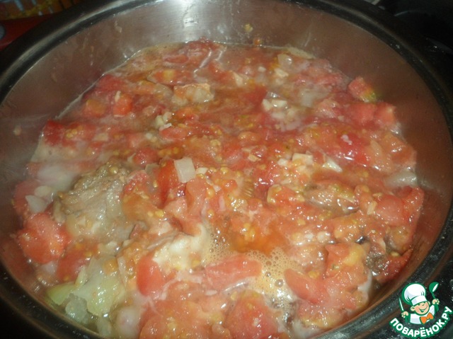 Перекладываем помидоры на мясо так, чтобы мясо утонуло в помидорах и соке.