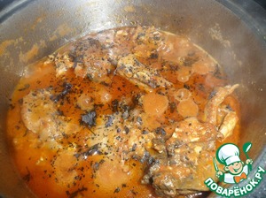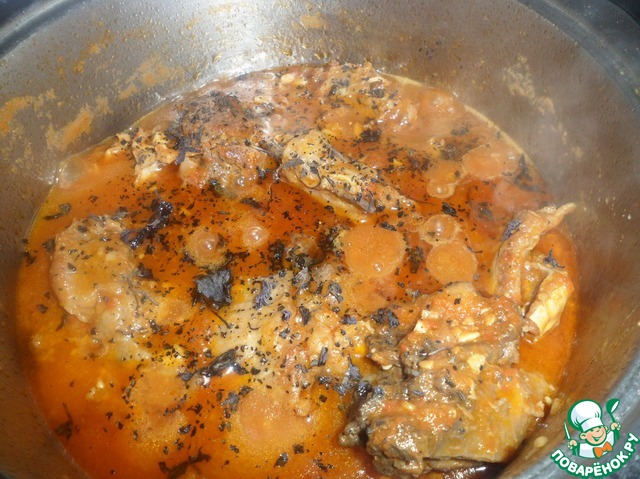 Солим, перчим, накрываем крышкой и забываем примерно на 1,5 часа (пока мясо не начнет легко отделяться от костей). -
