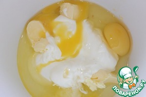 Сливочное масло комнатной температуры, сметану и яйца взбиваем миксером до однородной консистенции.